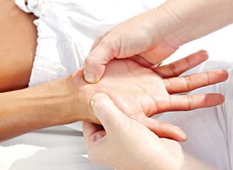For example, the pressure point Neiguan (P-6) is primarily used to treat nausea and vomiting. To find it, turn your hand palm up.4 Place your thumb at the center of where the hand meets the wrist. Move your thumb two finger-widths toward the elbow. The point is between two large tendons, which you should be able to feel as you apply pressure.